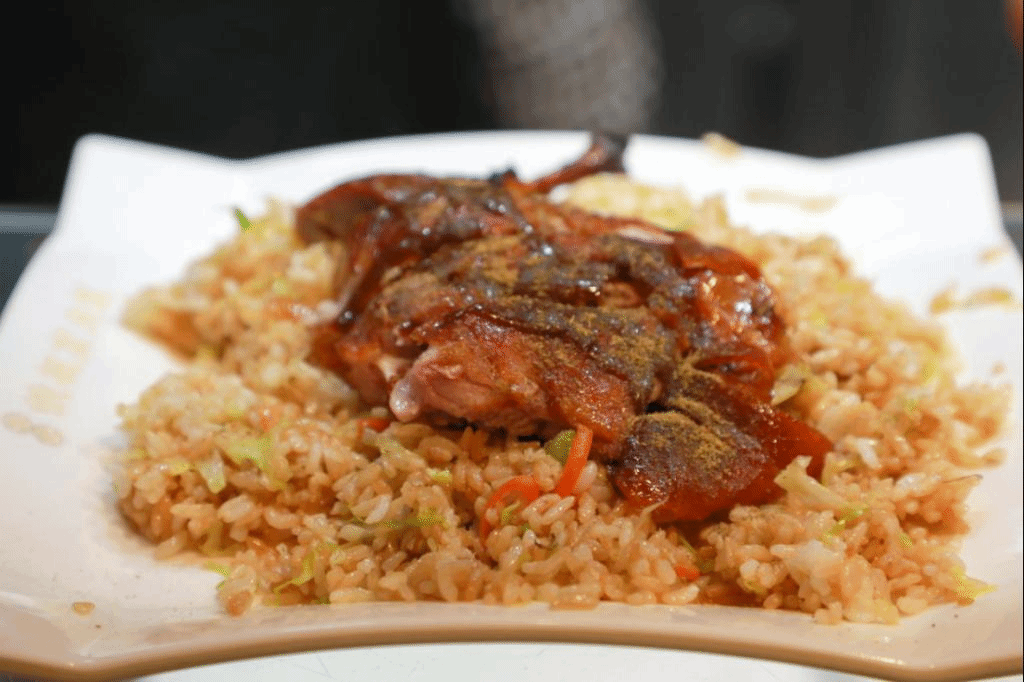 红润油亮的烤鸭搭配松软的米饭,