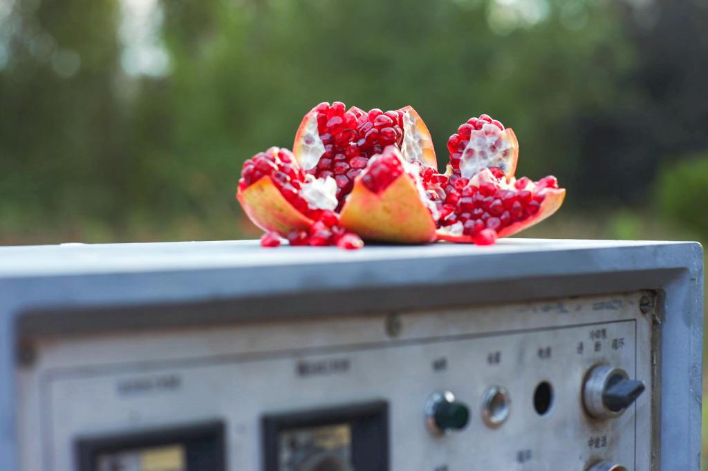 美艳炽热的石榴籽在古朴微凉的金属间悄然绽放,迎接阳光(王亚培摄)